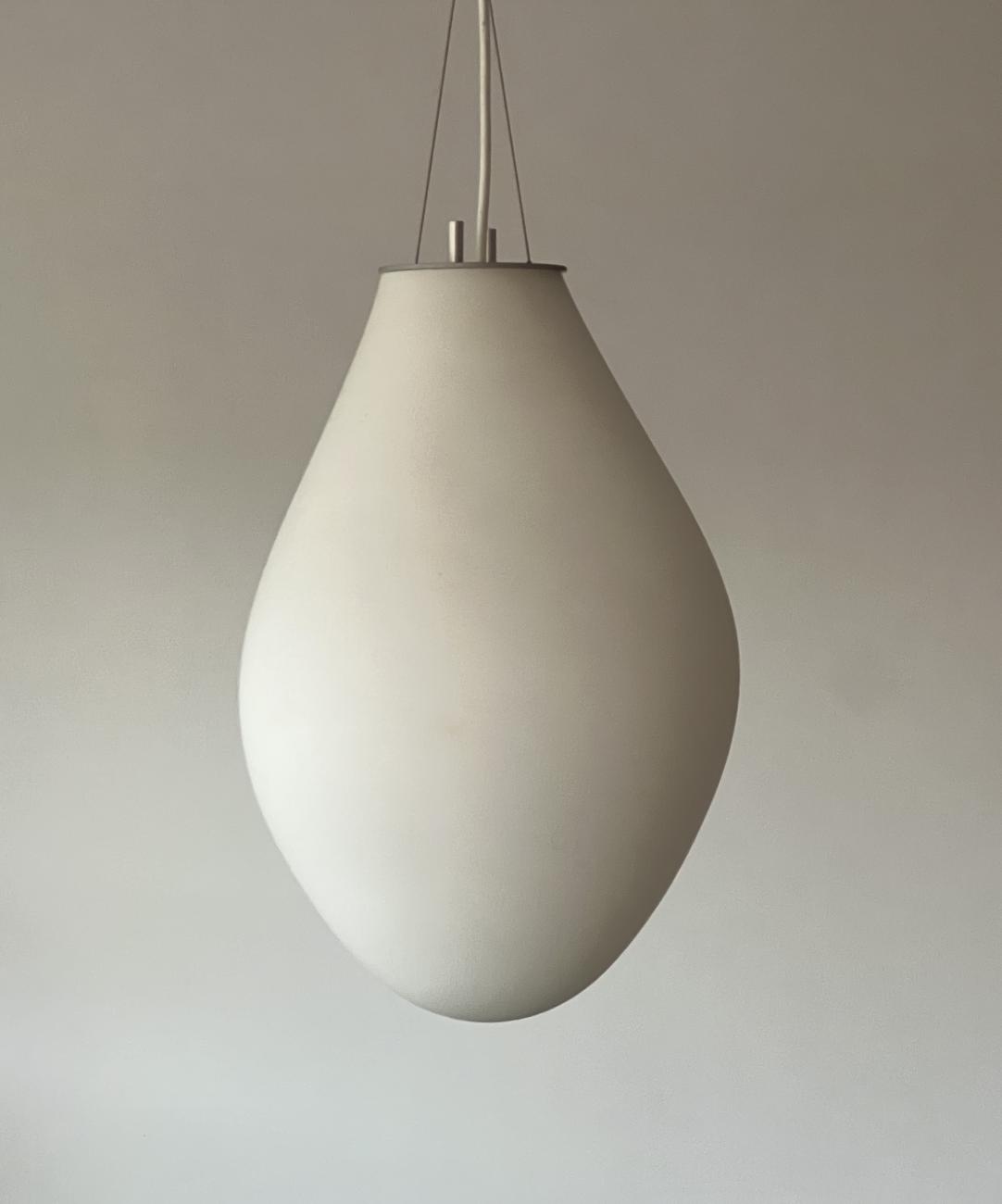 Glas, matterat, upphängningsanordning av metall och vajer.